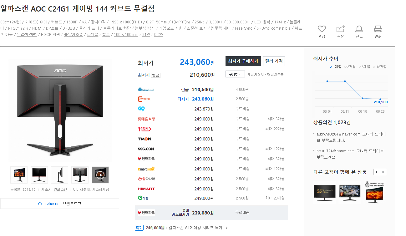 | 24인치 24.3만원 게이밍 모니터 추천 (알파스캔 AOC C24G1 게이밍 144 커브드 무결점) (0) | 2019.06.27 |
